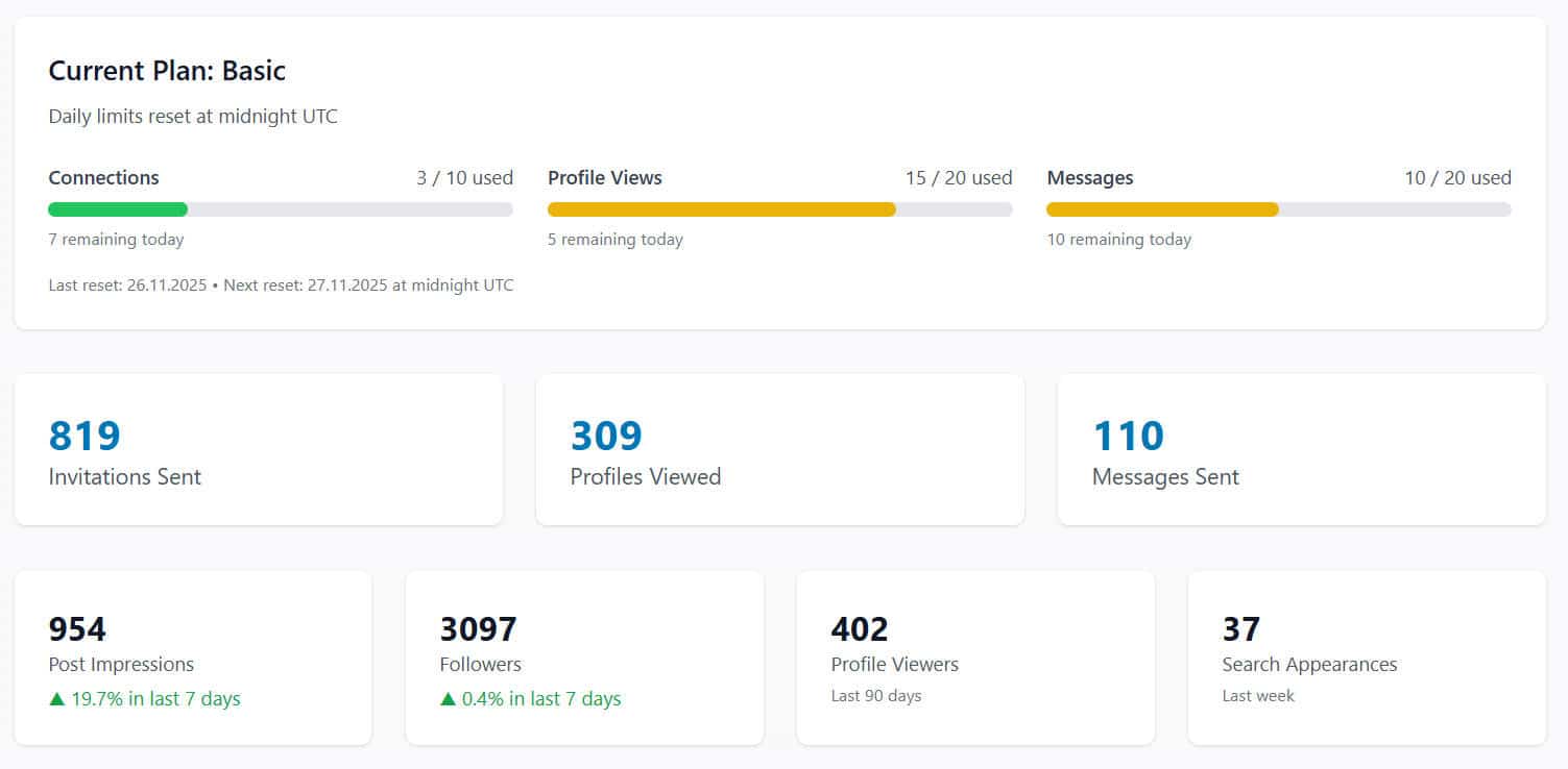 Schedule automated tasks to run during specific hours while strictly respecting LinkedIn's daily limits to ensure account safety.